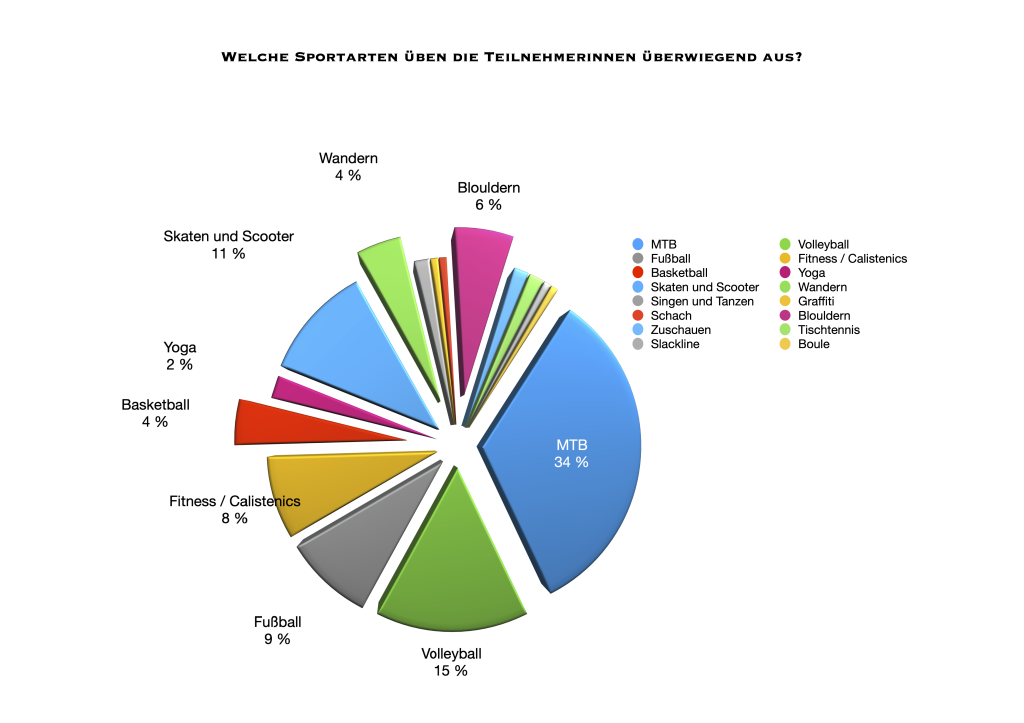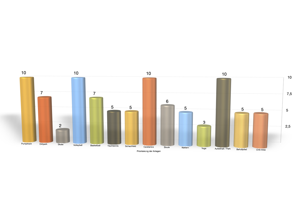 Hohe Priorität bei den TN hat eine attraktive Rollsport-Anlage: ein asphaltierter Pumptrack mit mehreren Lines ist besonders gewünscht. Ergänzend wurden Dirtjumps in unterschiedlichen Schwierigkeitsgraden sowie Elemente für Inliner, BMX, Skateboard und MTB. Auch eine Flow-line über den Hügel für Laufräder wurde benannt.